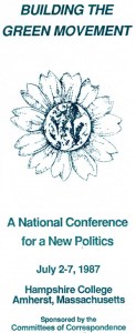 The first national Green Politics gathering was held in July 1987 at Hampshire College in Amherst, MA, with the theme “Building the Green Movement—A National Conference for a New Politics.” The conference brochure stated, “We invite all Greens and activists in kindred social change movements to participate in this educational conference. We are not gathering to make decisions for the Green movement. Our purpose is education. It will be a chance for Greens and activists in kindred movements from across the land to meet, share perspectives, and learn from each other